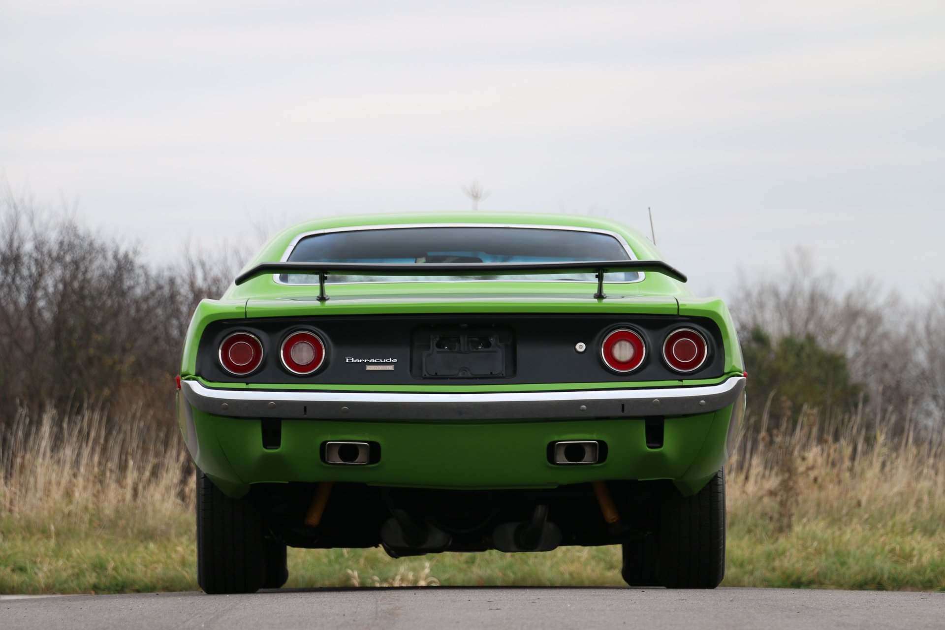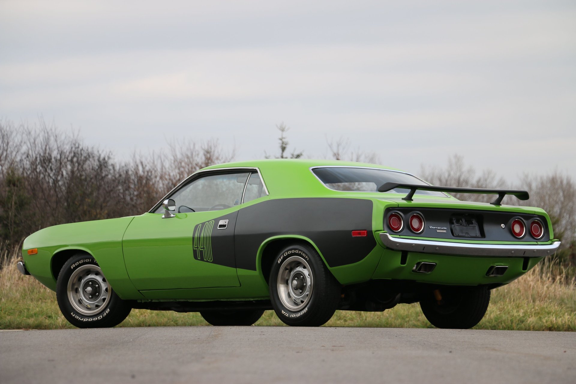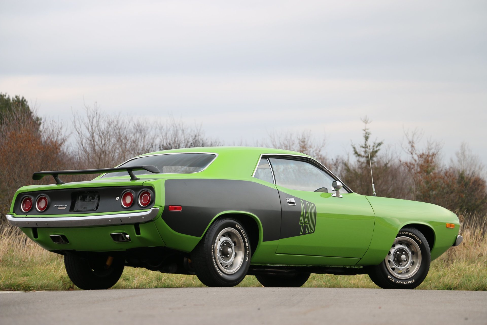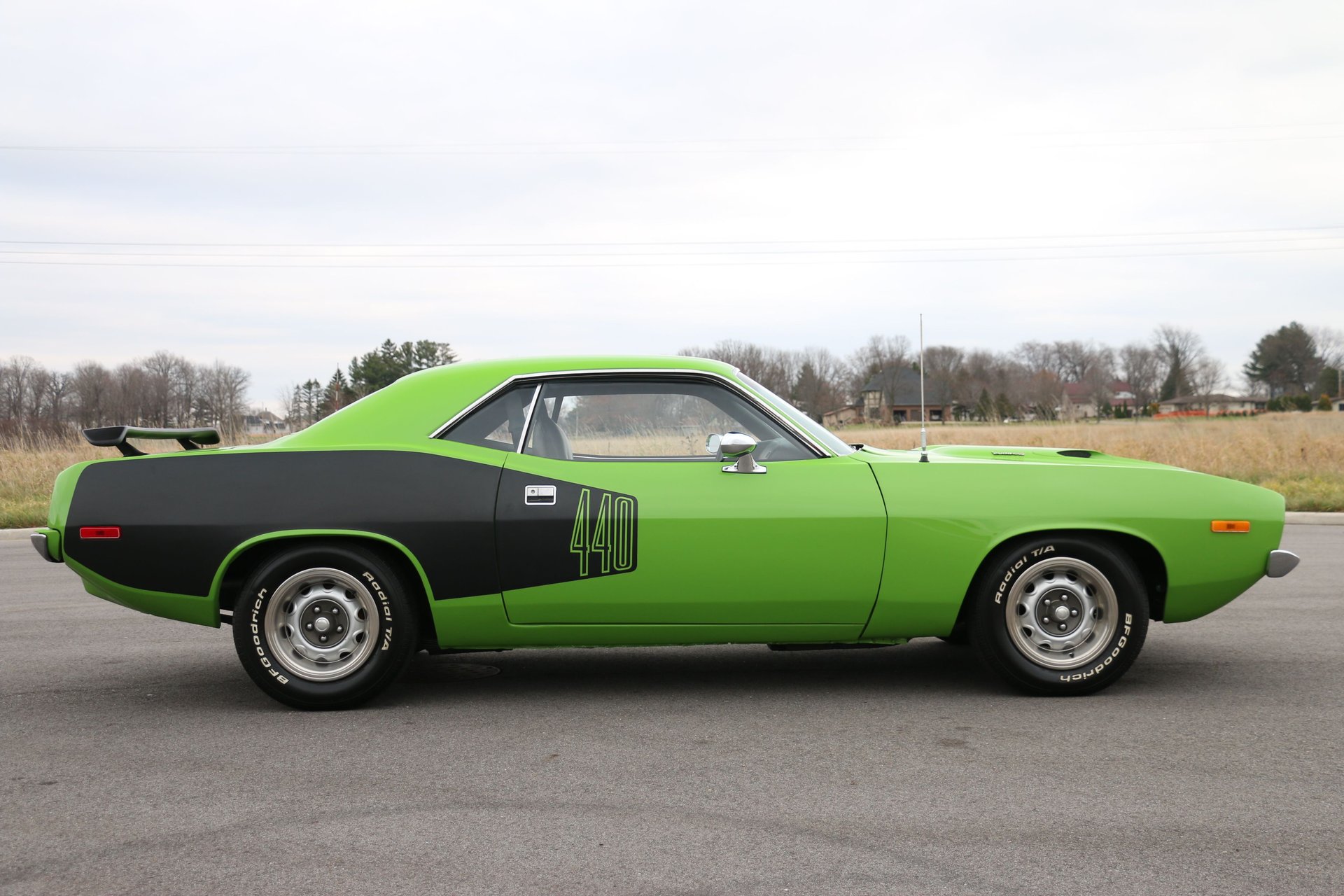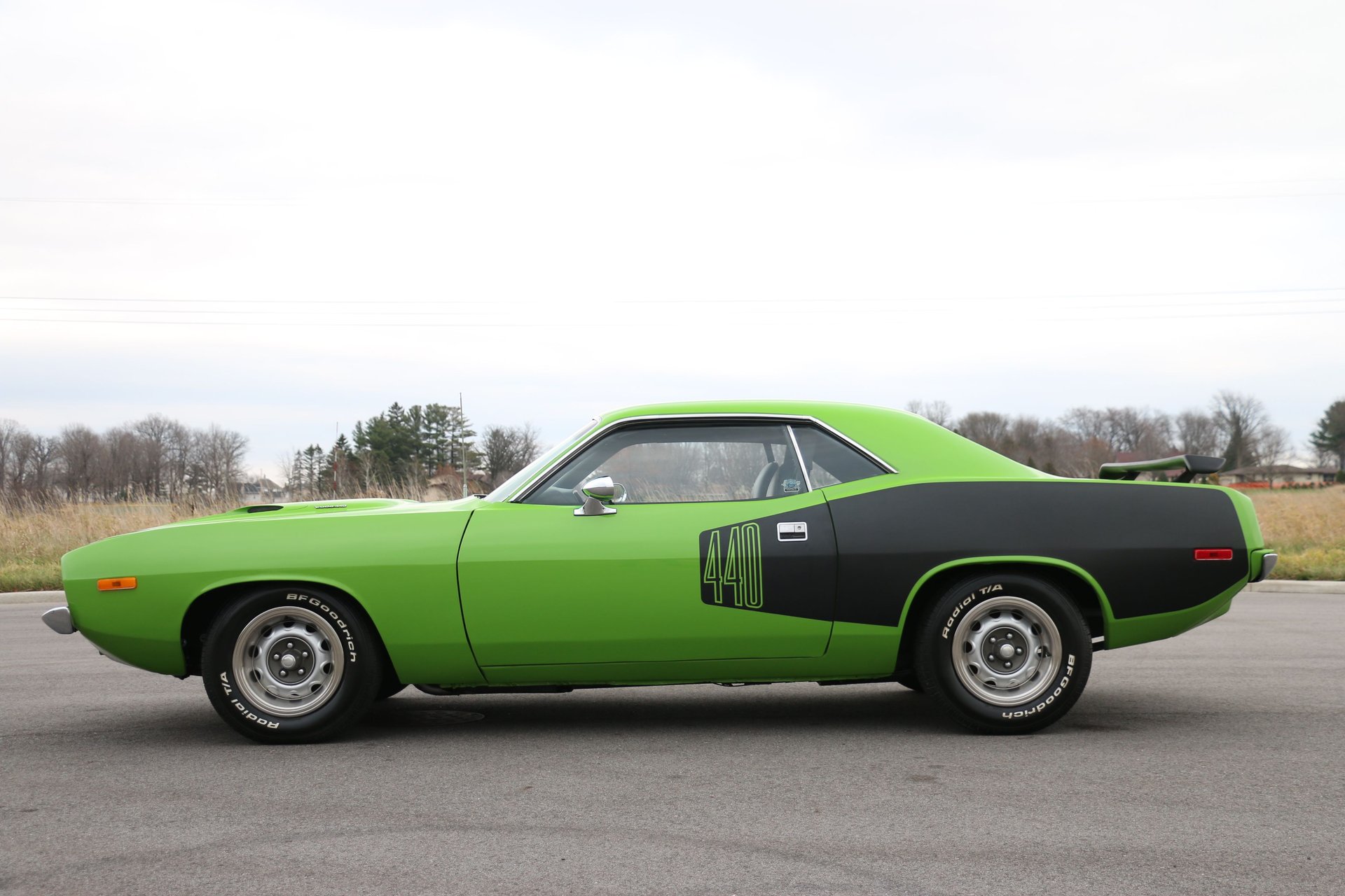 Here is a great example of a 1973 Plymouth Barracuda. Now powered by a Slightly built 1976 440 V8 paired to a rebuilt automatic transmission. The 440 is topped with an Edelbrock Performer Air Gap aluminum intake, Holley Street Avenger carb, aluminum radiator, and full length headers with all new exhaust. Very nice Lime green paint with 440 Billboard decal. Black interior with bucket seats and center console with Slap Stick shifter.