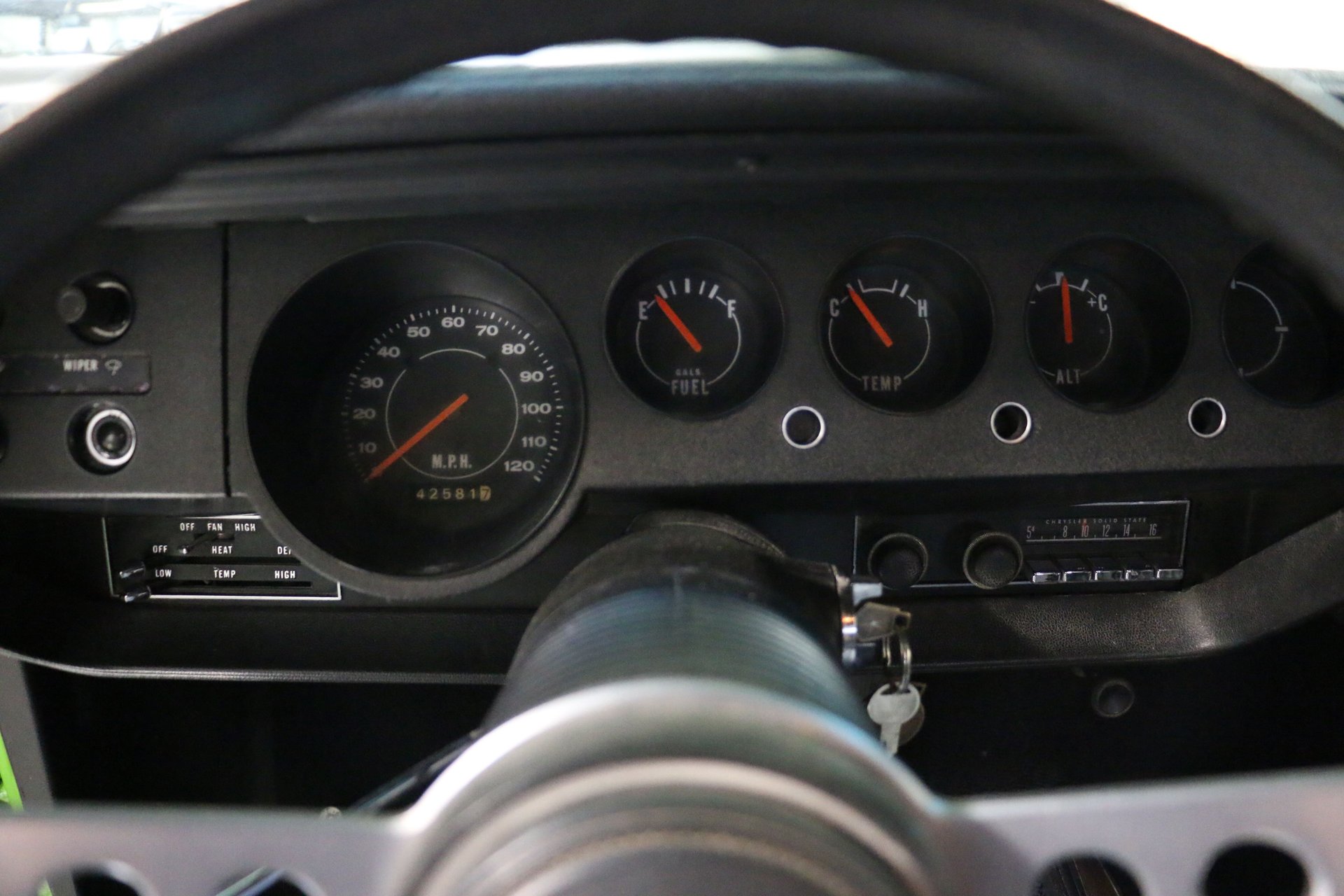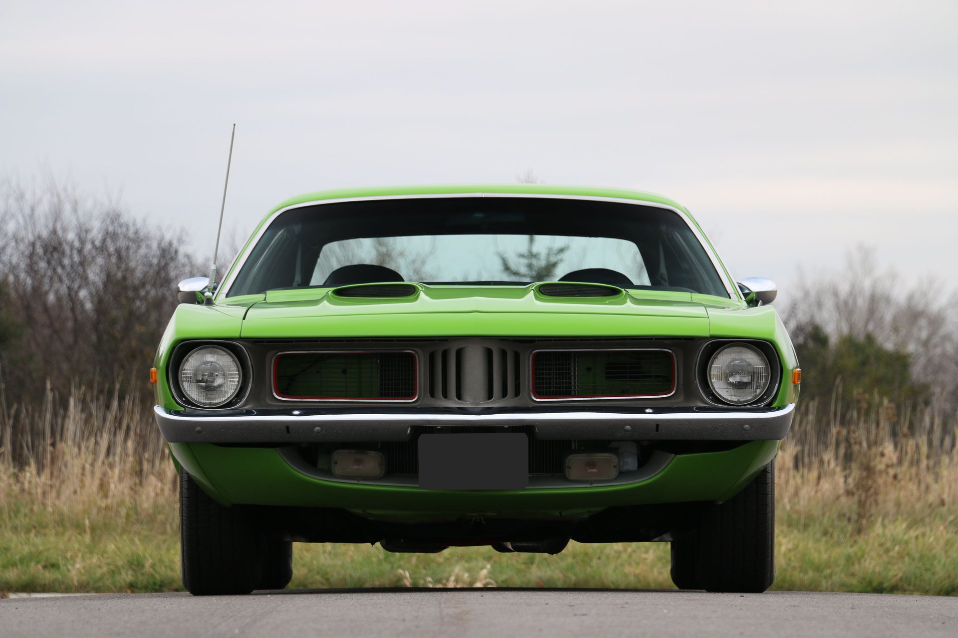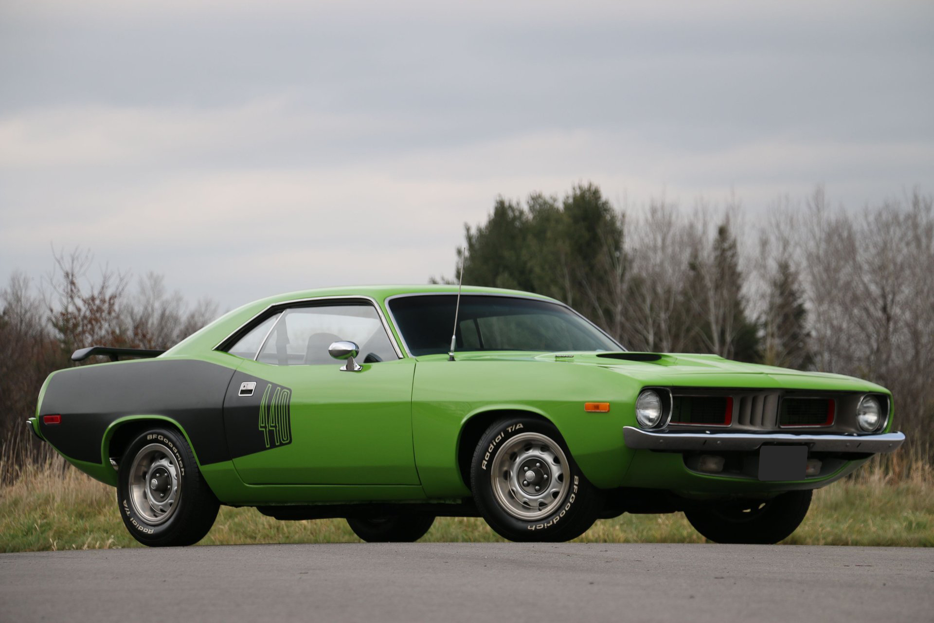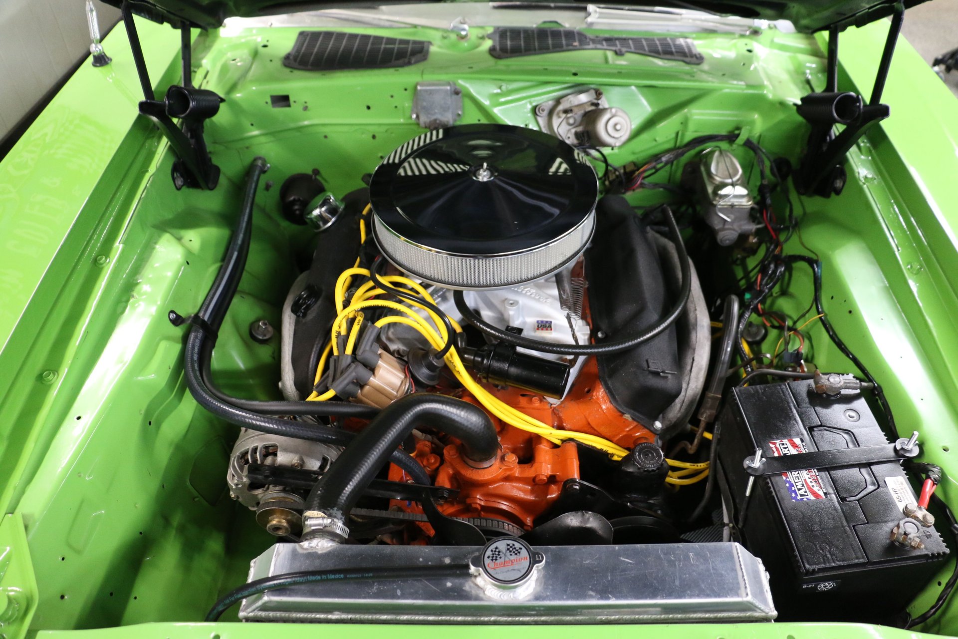 Here is a great example of a 1973 Plymouth Barracuda. Now powered by a Slightly built 1976 440 V8 paired to a rebuilt automatic transmission. The 440 is topped with an Edelbrock Performer Air Gap aluminum intake, Holley Street Avenger carb, aluminum radiator, and full length headers with all new exhaust. Very nice Lime green paint with 440 Billboard decal. Black interior with bucket seats and center console with Slap Stick shifter.