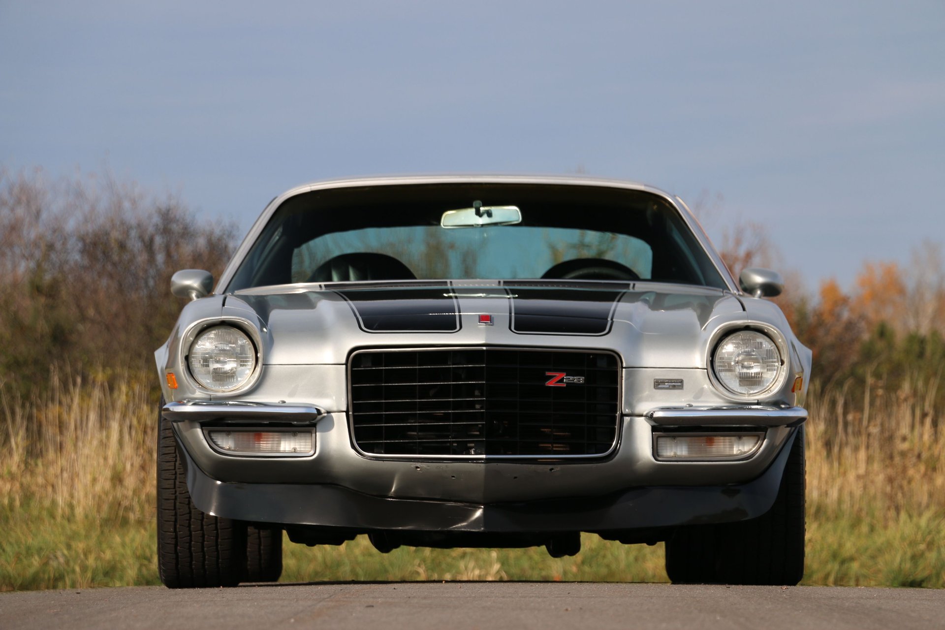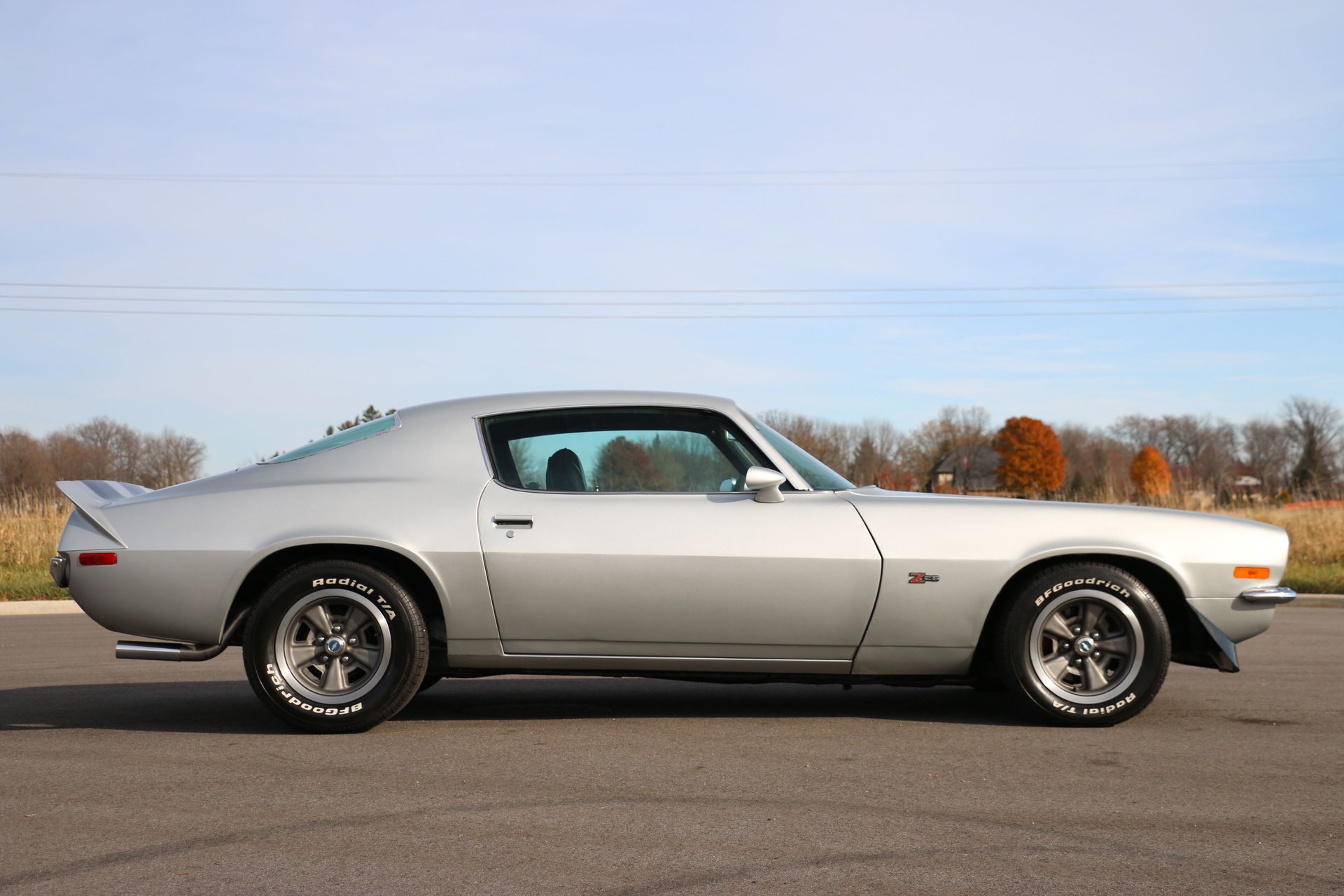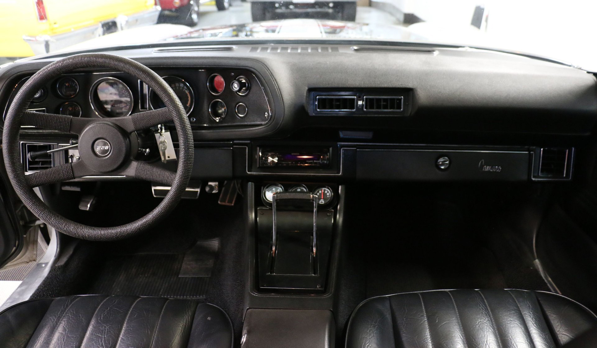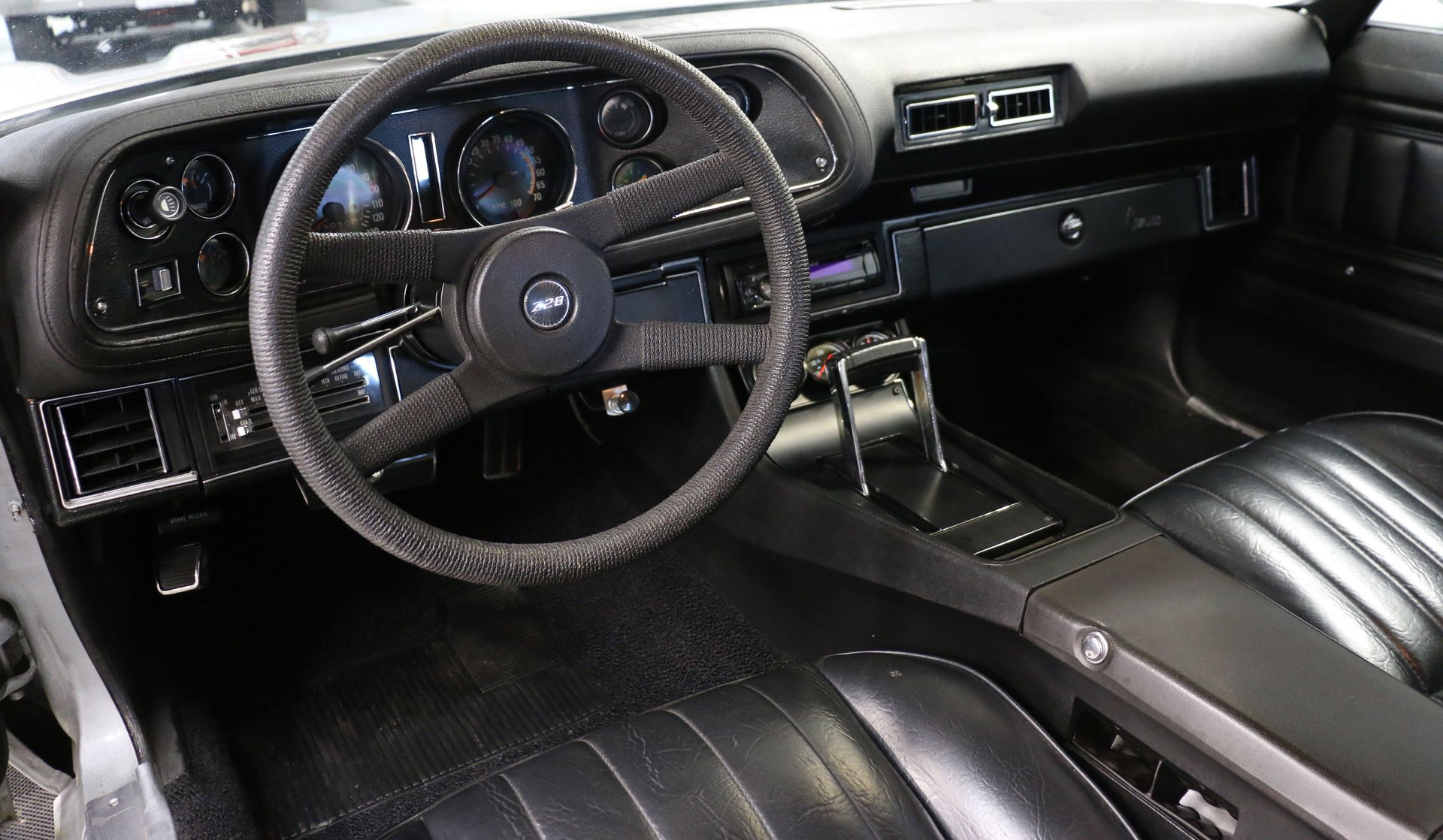Here is a clean 1973 Split Bumper Camaro. Originally an LT Sport Coupe. Cortez Silver and black rally stripes with metal flake. Powered by a 350 small block paired to a TH350 3 speed automatic transmission. Equipped with power steering, power front disc brakes, Edelbrock carburetor, Edelbrock Performer EPS intake, HEI ignition, full length stainless steal headers and aluminum radiator. The interior is in great shape with aftermarket cloth shell headliner, new gauge bezel, tilt steering column, center console with staple shifter, factory tachometer and a Kenwood CD player.